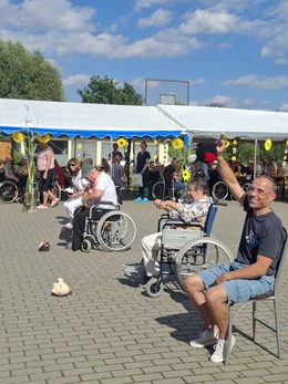 Dnia 04.09.2025r. w Domu Pomocy Społecznej w Kwidzynie odbył się Integracyjny Piknik Rodzinny dla mieszkańców i ich bliskich. Wydarzenie rozpoczęło się powitaniem gości przez Dyrektor placówki, Panią Joannę Stasińską. W programie znalazły się m.in.: zabawa rozrywkowa „Familiada”, słodki poczęstunek oraz liczne gry zespołowe – skoki w workach, „ubieranie pampersa”, bilard, zwijanie gazety nogami czy zwijanie sznurka z maskotką do muzyki z „Benny Hilla”. Całość odbywała się w klimacie późnego lata – wśród słoneczników, z kanapą ze snopków siana i fotoramką w kształcie wielkiego słonecznika. Oprawę muzyczną zapewnił Pan Jarek, a uczestnicy wspólnie śpiewali ludowe przyśpiewki. Było radośnie, kolorowo i rodzinnie – ten dzień na długo pozostanie w pamięci wszystkich obecnych. Dziękujemy wszystkim, którzy byli z nami tego dnia – to było prawdziwe święto bliskości i wspólnoty!
