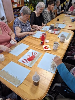 11 września 2025 r. podczas zajęć terapeutyczno-sensorycznych mieszkańcy wykonali kraba, odbijając na kartce swoje dłonie pomalowane farbą. Podczas pracy opisywali, co czują pod palcami, przyklejali piasek, a chmury tworzyli z miękkiej waty. Zajęcia pozwoliły na poznawanie różnych struktur i faktur, rozwijając zmysł dotyku.