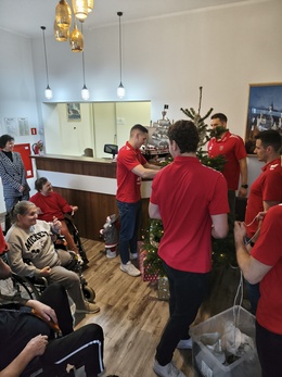 Dnia 12.12.2025r w ramach akcji „Święty Mikołaj dla Seniora” nasz Dom odwiedziła drużyna piłki ręcznej MMTS Kwidzyn. Piłkarze, którym 10.12.2025r kibicowaliśmy podczas meczu zostali zaproszeni przez Seniorów do wspólnego ubierania choinek na oddziałach Domu. Radości, śmiechu i wzruszeń było co nie miara. Spotkanie zakończyło się wspólnym słodkim poczęstunkiem , a na pamiątkę wydarzenia Seniorzy otrzymali piłkę z autografami całej drużyny.