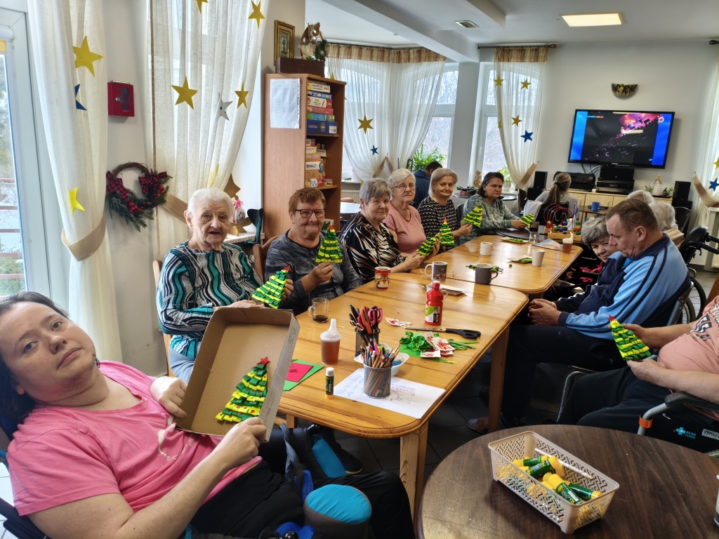 Dnia 02.01.2026r na zajęciach terapii w ramach zajęć z arteterapii mieszkańcy tworzyli papierowe choinki. Z karteczek klejone były łezki , które po naklejeniu na przygotowany wcześniej kształt choinki utworzyły piękną całość. Prace ozdobione zostały odciskami palców , które zatopione w kolorowej farbie stworzyły na choince kolorowe bombki. Prace dały wiele radości i pozwoliły na rozwinięcie własnej kreatywności.