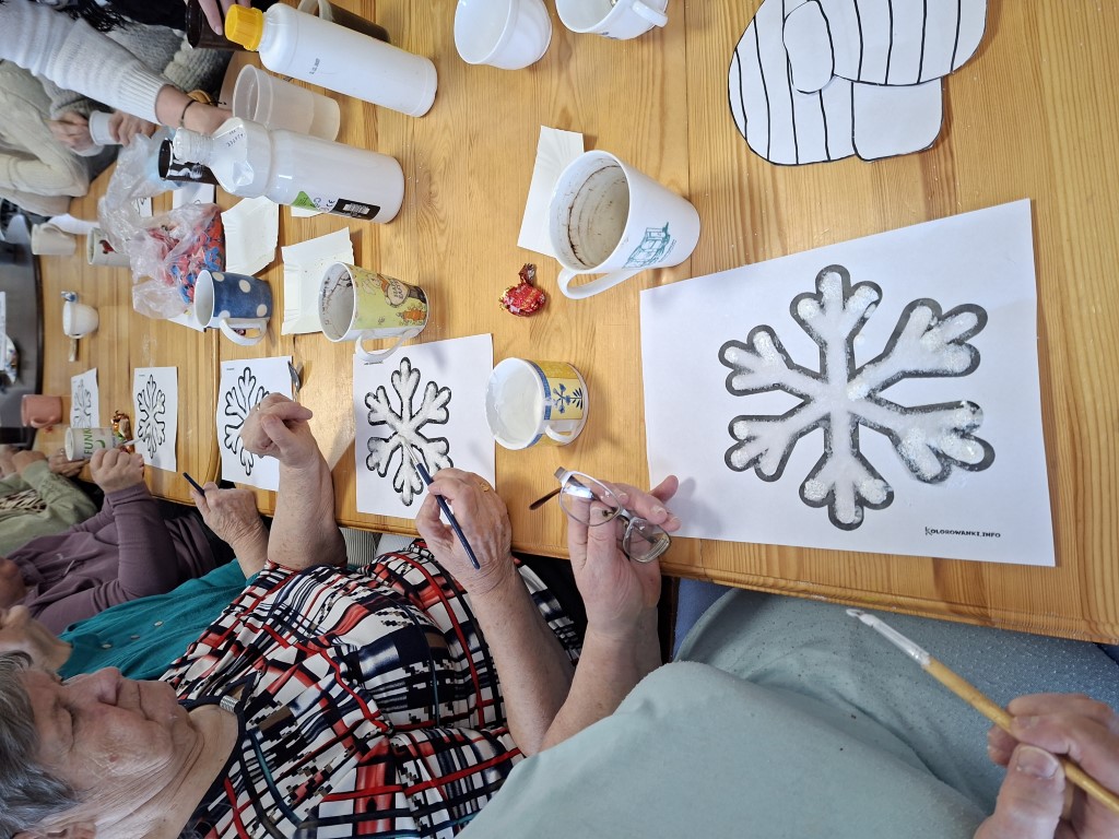 Nasi mieszkańcy w dniu 23.01.2026r podczas zajęć wykonywali efektowne śnieżynki. Zajęcia plastyczne pozwoliły na wykazanie się kreatywnością naszych Seniorów, którzy najpierw wycinali różne kształty śnieżynek, a potem za pomocą kleju i cukru tworzyli niesamowitą strukturę pracy. Gotowe, obsypane brokatem prace ozdobiły salę terapii tworząc zimowy nastrój.