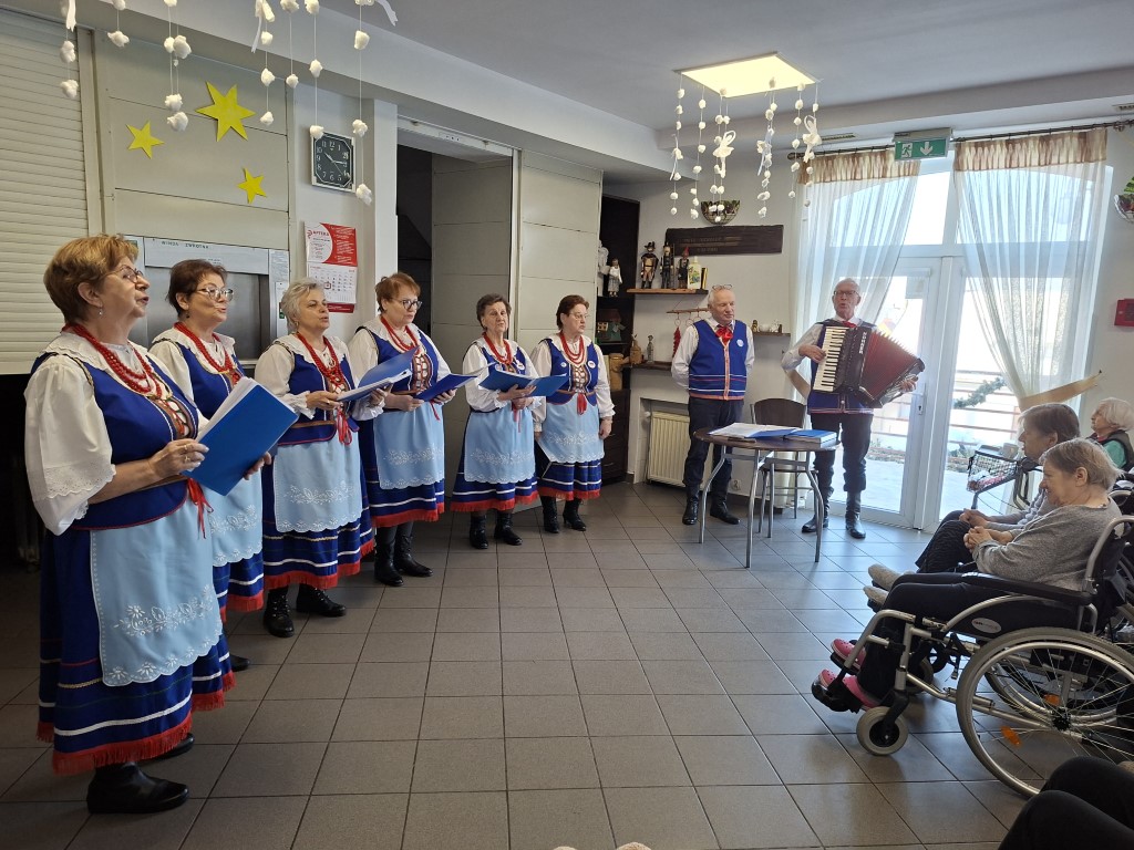 Jak co roku w naszym Domu świętujemy Dzień Babci i Dziadka przypadający w dniach 21-22.01.2026r. Z tej to okazji Mieszkańcy otrzymali słodkie mufinki , które upiekły nasze Panie kucharki, a ukoronowaniem dnia był występ” Marezianek”. Artystki przybyły do nas w pięknych kolorowych strojach ludowych, tworząc podczas występu wyjątkową, radosną i ciepłą atmosferę. Śpiewane były kolędy, które sprawiły, że niejednym oku pojawiła się łezka radości.