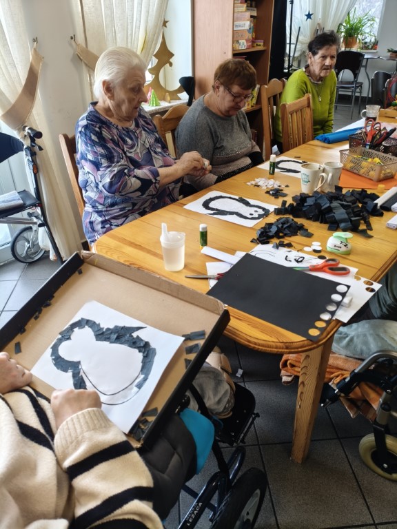 Nasi mieszkańcy w dniu 12.01.2026r podczas zajęć wykonali pingwiny z papieru. Prace były bardzo pracochłonne i wymagały dużego zaangażowania naszych Seniorów. Z małych pociętych karteczek wyklejane były czarne fraki i białe brzuszki pingwinów. Prace wyszły przepięknie i ozdobiły oddział naszych mieszkańców.