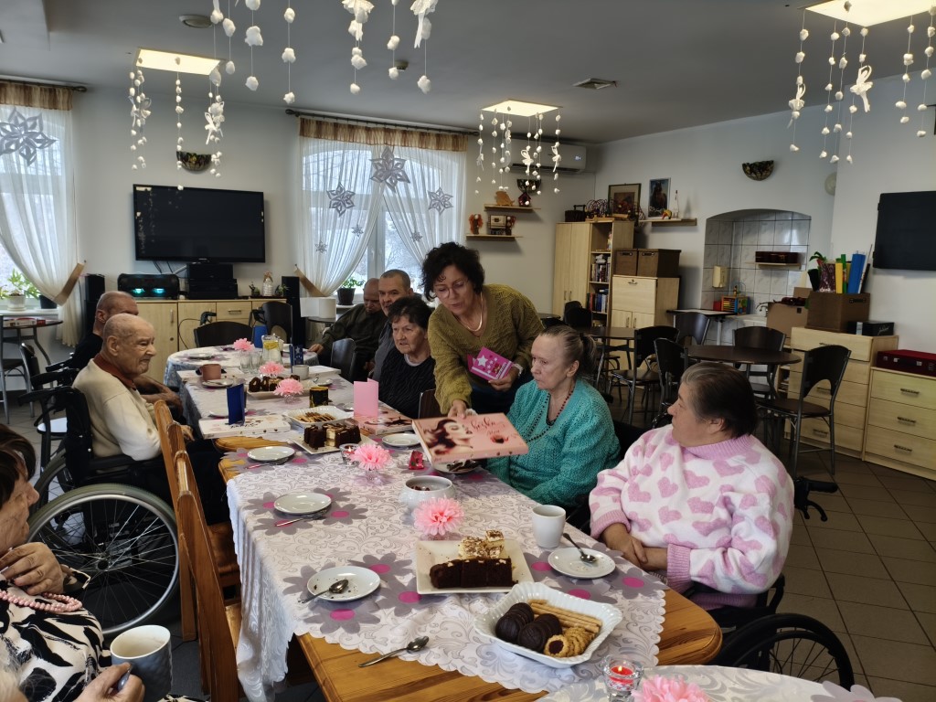 Dnia 28.01.2026r. odbyła się uroczystość urodzinowa dla wszystkich mieszkańców urodzonych w miesiącu styczniu. Seniorzy w miłej atmosferze świętowali swoje urodziny. Były życzenia, piękne laurki ręcznie robione oraz słodkie podarunki. Na stołach pojawiły się pyszne ciasta przygotowane przez nasze Panie kucharki, a sala terapii została pięknie przystrojona na tą okazję. Mieszkańcy śpiewali urodzinowe piosenki i każdy każdemu życzył: „ sto lat”.