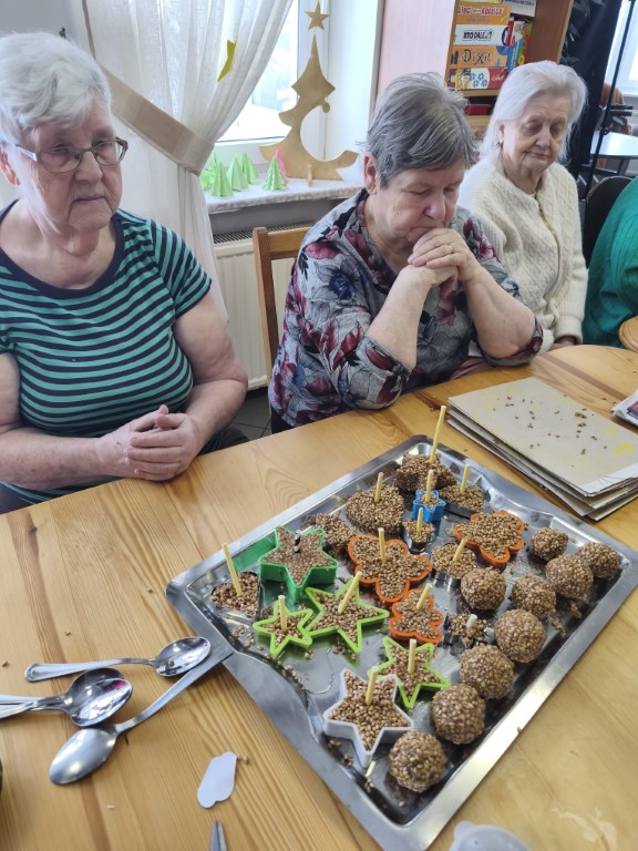 Podczas zajęć dnia 13.01.2026r mieszkańcy mieli okazję wykonać zawieszki z ziaren dla ptaków. Różne gatunki ziaren były mieszane i formowane w różne kształty przy użyciu foremek. Zawieszki to doskonały pomysł na zimowe dokarmianie ptaków , które pod pierzyną ze śniegu nie mogą znaleźć nic dla siebie do jedzenia. Gotowe prace zawisły na drzewach, a nasi Seniorzy byli dumni, że też mogą o kogoś zadbać.